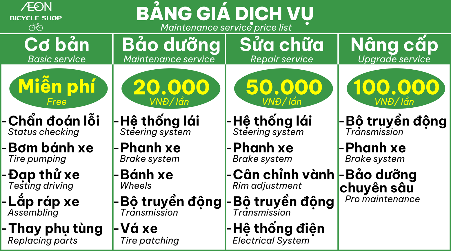 AEON BICYCLE SHOP là chuỗi cửa hàng chuyên về xe đạp, phụ kiện và dịch vụ sửa chữa theo tiêu chuẩn