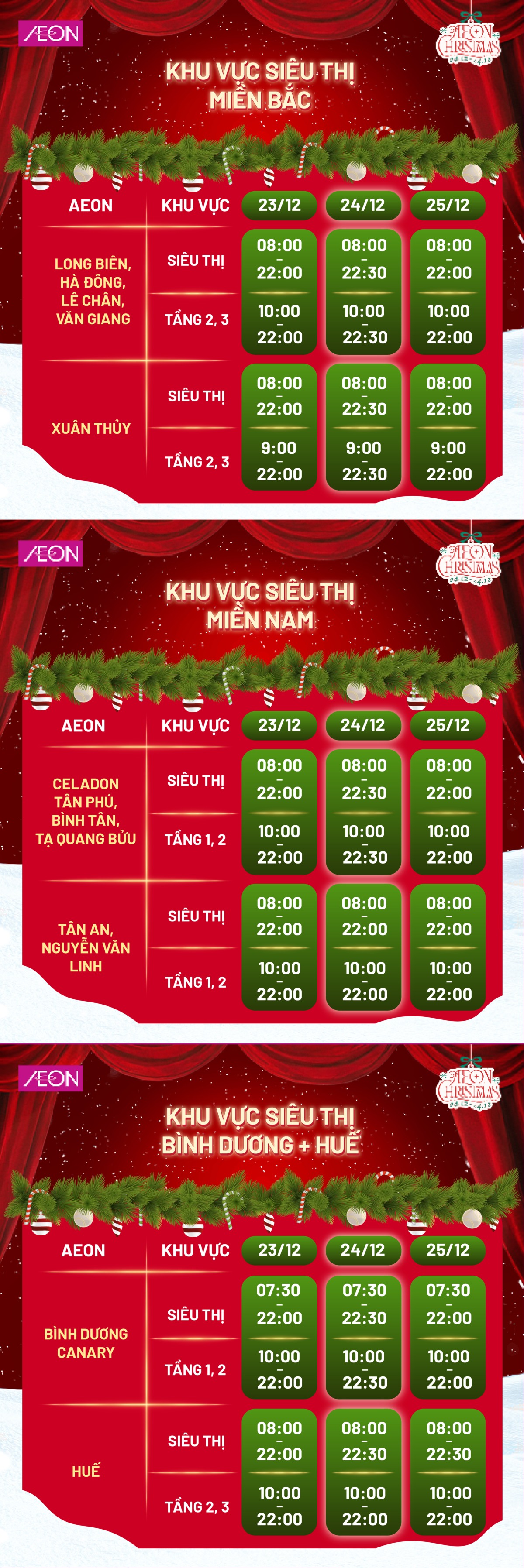 AEON Tân Phú Celadon, AEON Bình Tân, AEON Long Biên, AEON Hà Đông, AEON Tạ Quang Bửu, AEON Xuân Thuỷ, AEON Huế, AEON Tân An, AEON Văn Giang, AEON Bình Dương Canary, AEON Bình Dương New City, AEON Hải Phòng Lê Chân