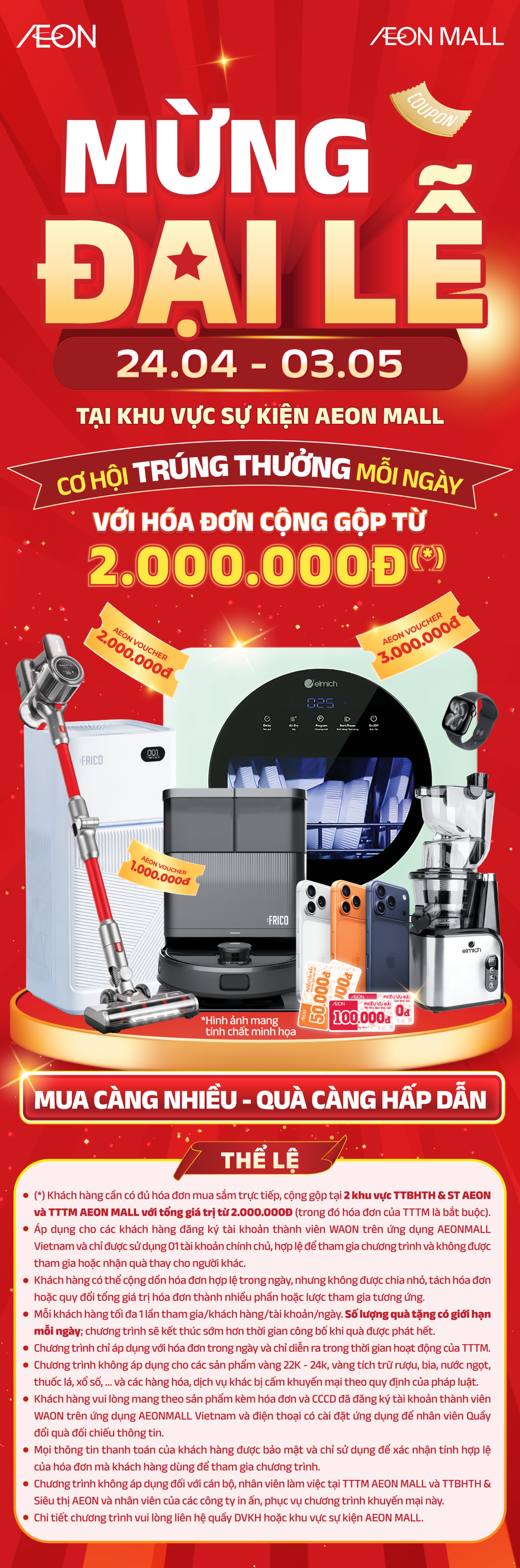 AEON MIDORI PARK, AEON Tân An, AEON Văn Giang, AEON Xuân Thuỷ, AEON Huế, AEON Tạ Quang Bửu, AEON Tân Phú Celadon, AEON Bình Tân, AEON Hà Đông, AEON Long Biên, AEON Hải Phòng Lê Chân, AEON Bình Dương Canary, AEON Nguyễn Văn Linh