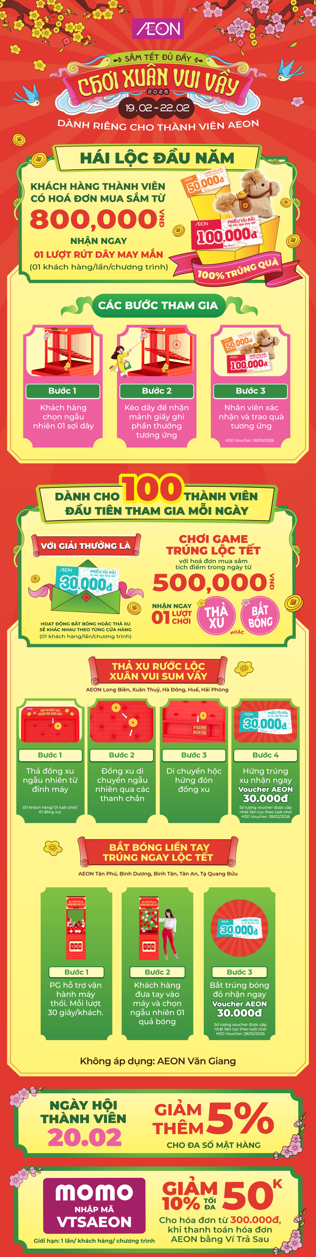 AEON Tân Phú Celadon, AEON Bình Tân, AEON Long Biên, AEON Hà Đông, AEON Hải Phòng Lê Chân, AEON Tạ Quang Bửu, AEON Xuân Thuỷ, AEON Bình Dương Canary, AEON The Nine, AEON Nguyễn Văn Linh, AEON Bình Dương New City, AEON MIDORI PARK, AEON Huế, AEON Tân An, AEON Văn Giang
