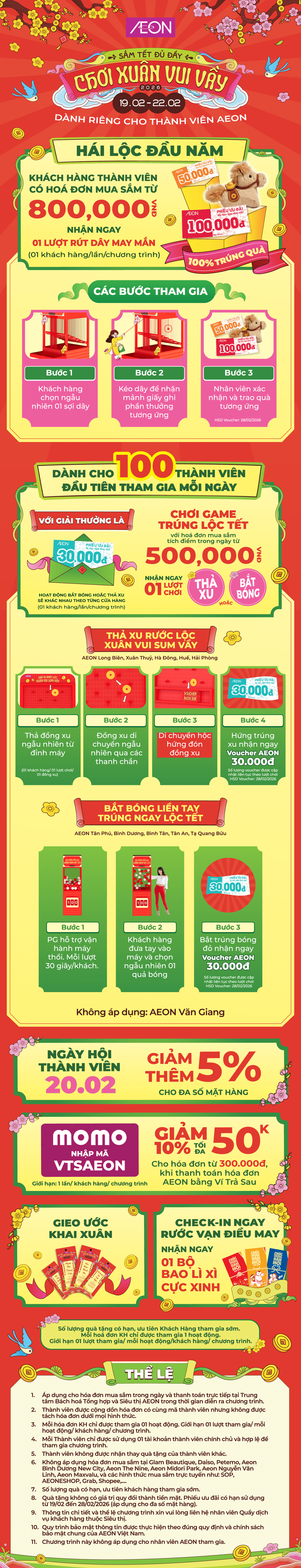 AEON Tân An, AEON Văn Giang, AEON Xuân Thuỷ, AEON MIDORI PARK, AEON Tạ Quang Bửu, AEON Huế, AEON Tân Phú Celadon, AEON Bình Tân, AEON Hà Đông, AEON Long Biên, AEON Hải Phòng Lê Chân, AEON Bình Dương New City, AEON The Nine, AEON Bình Dương Canary, AEON Nguyễn Văn Linh