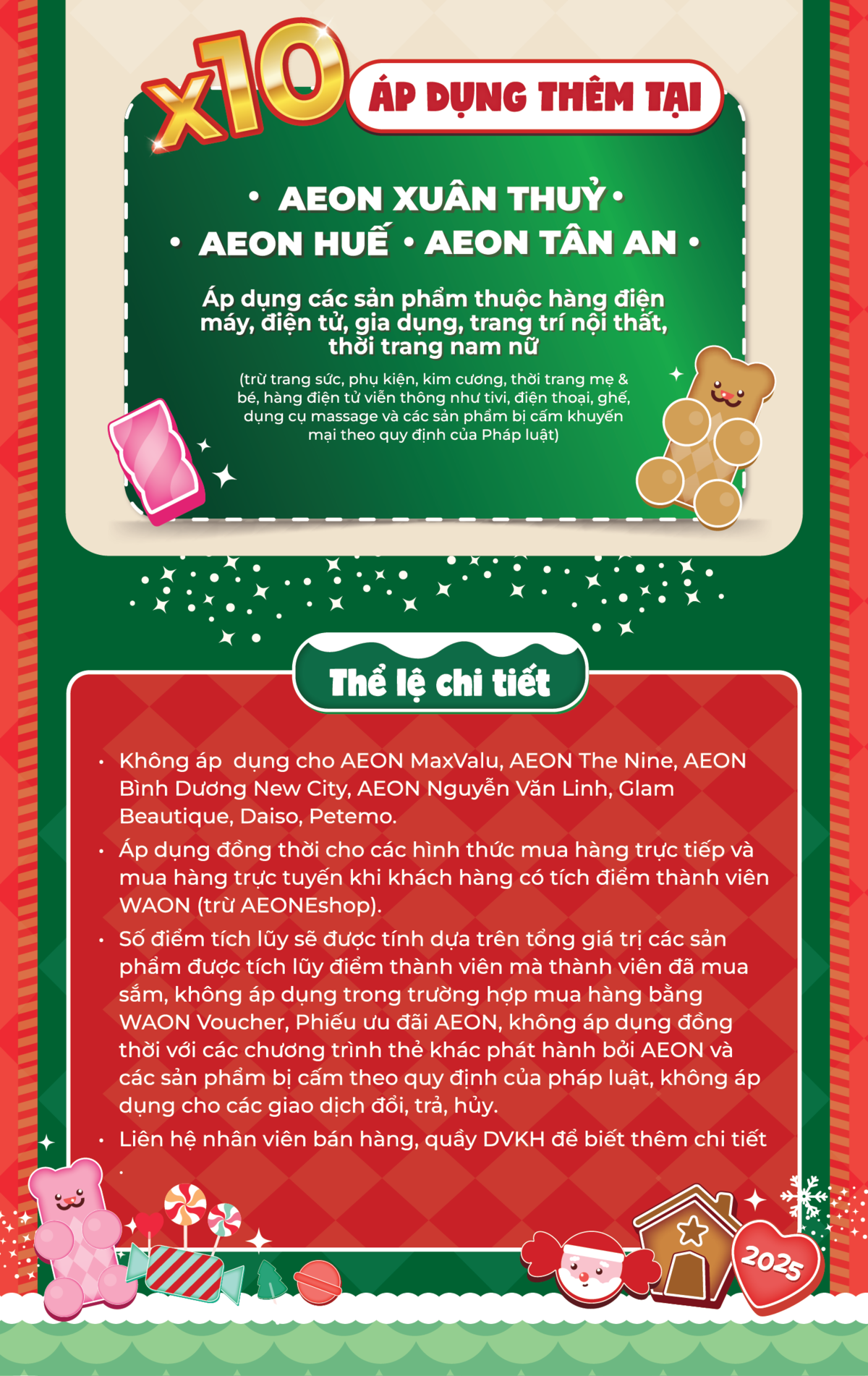 AEON Xuân Thuỷ, AEON MIDORI PARK, AEON Tân An, AEON Văn Giang, AEON Tạ Quang Bửu, AEON Huế, AEON Tân Phú Celadon, AEON Bình Tân, AEON Bình Dương New City, AEON Bình Dương Canary, AEON Long Biên, AEON Hà Đông, AEON Hải Phòng Lê Chân, AEON Nguyễn Văn Linh, AEON The Nine